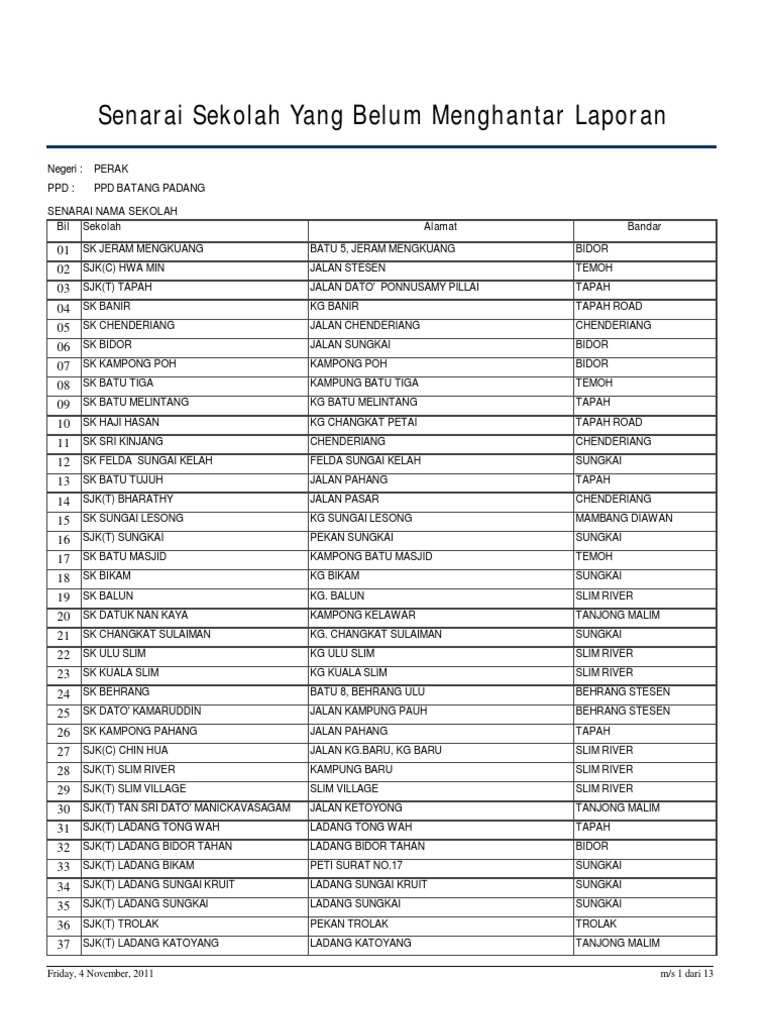 4 3440 kalaivani natchia ap asokan sk guru kalgidhar 5 2881 khew pei ping sjkc min sin 6 2927 looi xin yin sjkc st michael all angels. Senarai Nama Semua Sekolah Rendah di Negeri Perak Sejumlah 852 buah as at 31 January 2019. 4531900345 1010858248 Pejabat Pendidikan Daerah PPD.